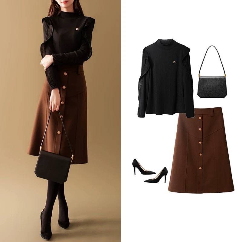 彼空E325加绒设计感上衣气质女套装2020秋冬新款毛呢半身裙两件套