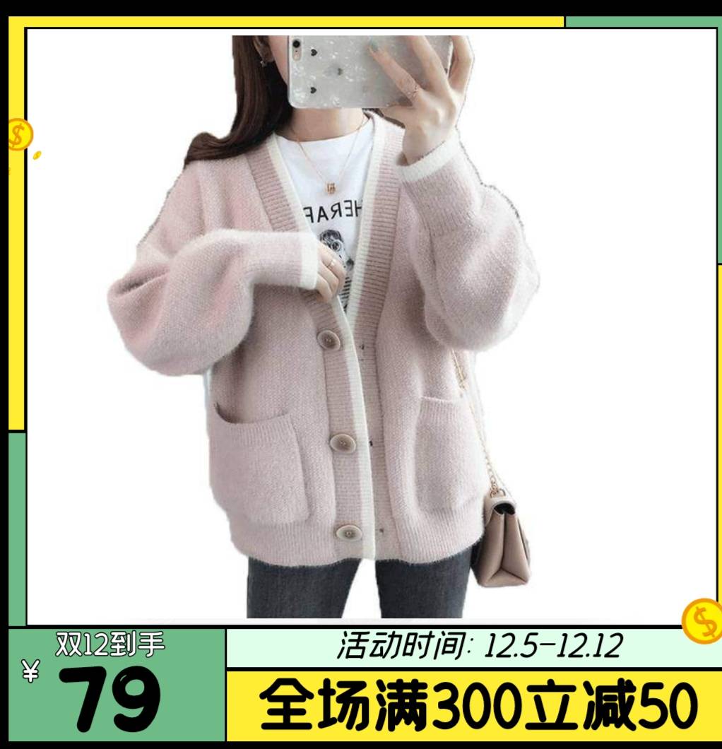 针织毛衣女秋冬新款女装撞色宽松长袖加厚V领开衫外套女 85.20 已售:0件