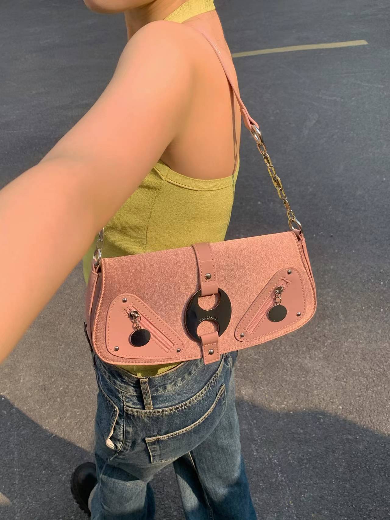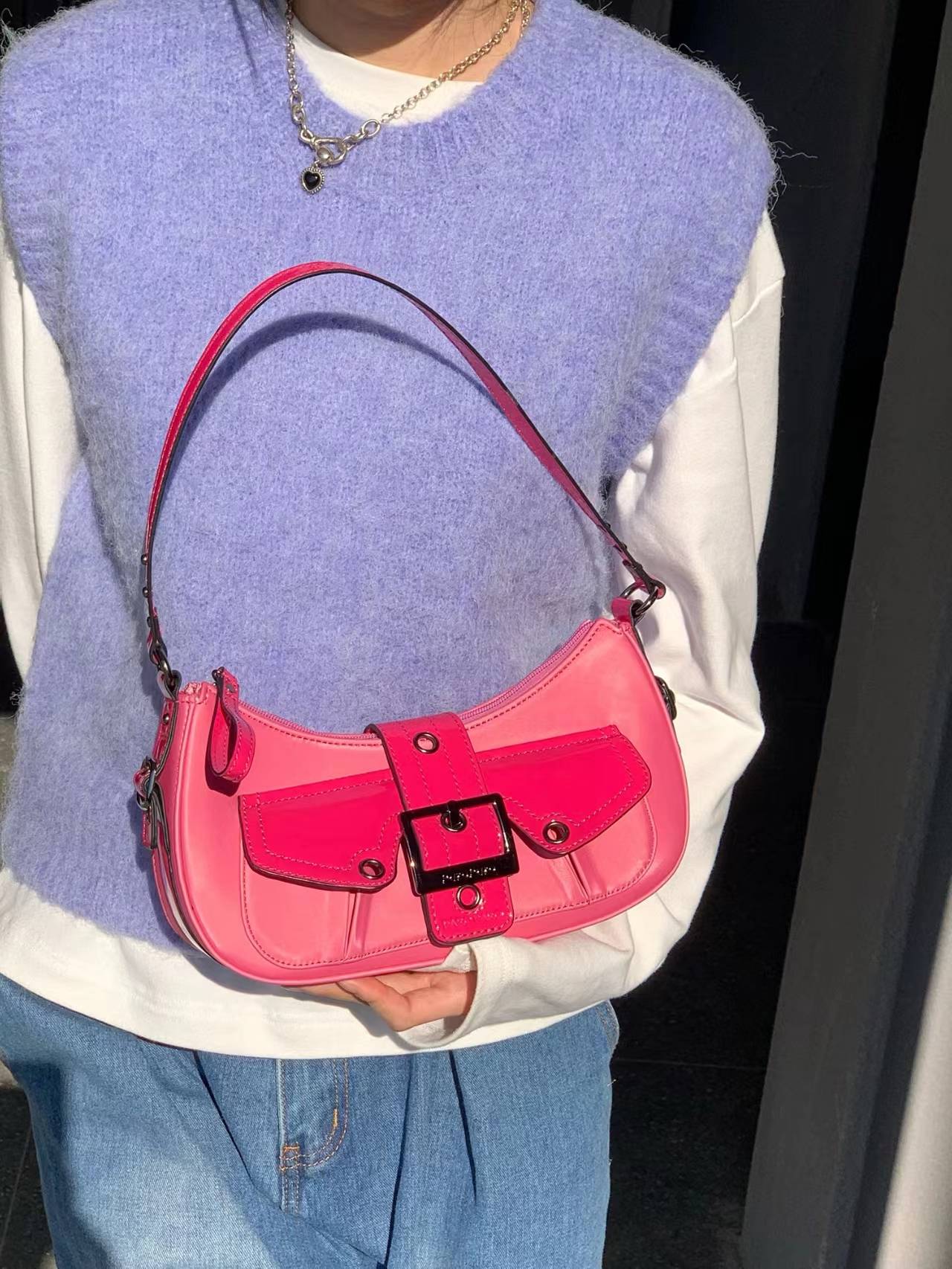 happy day玫玫甜心!原创美式复古辣妹玫粉拼接单肩腋下法棍包