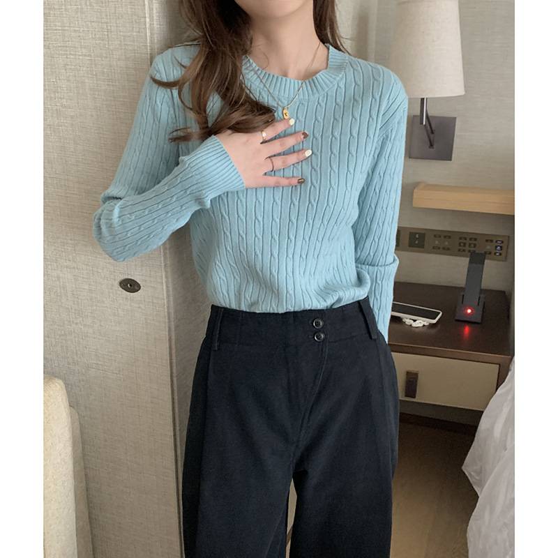 黄峥纯色麻花针织衫女2021秋冬韩版宽松温柔软糯圆领打底衫V5510