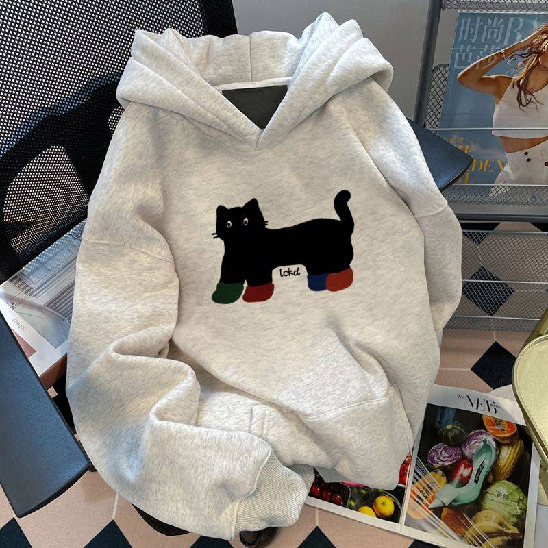 100%纯棉美式街头猫咪印花白灰色连帽卫衣女秋冬宽松潮流百搭上衣