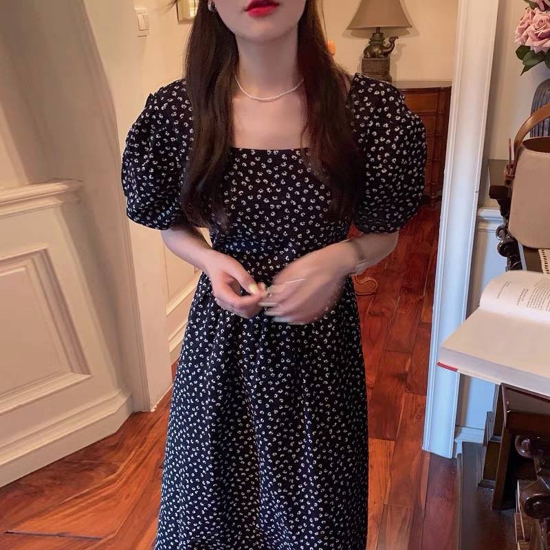 韩国chic法式复古方领小心机后背露腰设计显瘦泡泡袖碎花连衣裙女