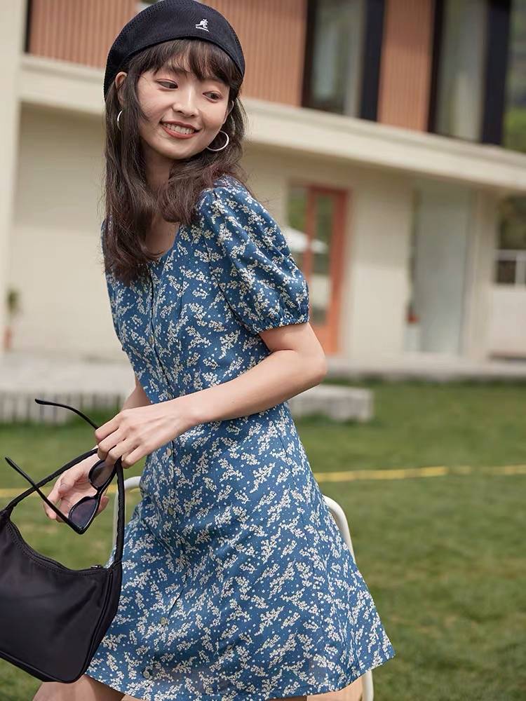 蓝色法式碎花女连衣裙赫本风2021新款夏方领a字短裙小个子桔梗