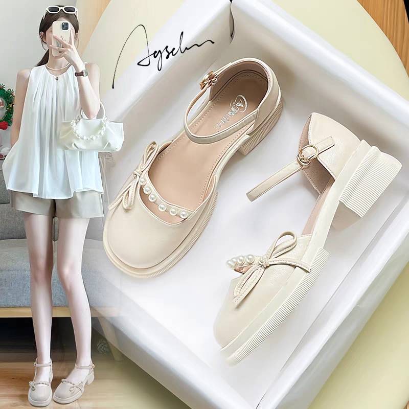 粗跟单鞋女2023夏季新款女鞋浅口厚底仙女风小皮鞋高跟鞋包头凉鞋