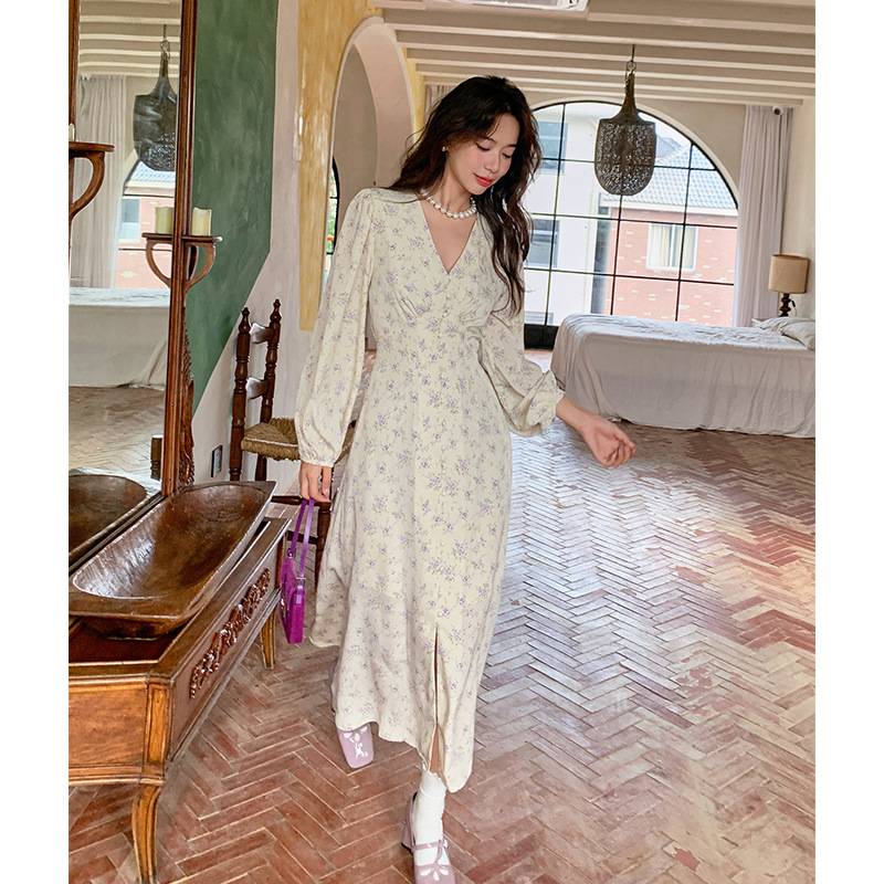 2022新款碎花连衣裙女法式小众长袖高腰显瘦开叉打底茶歇 裙秋