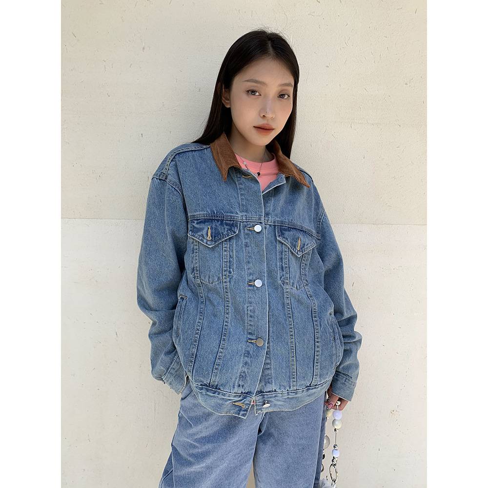 2022新款拼色翻领工装牛仔外套女 2022秋季韩风小个子夹克上衣女