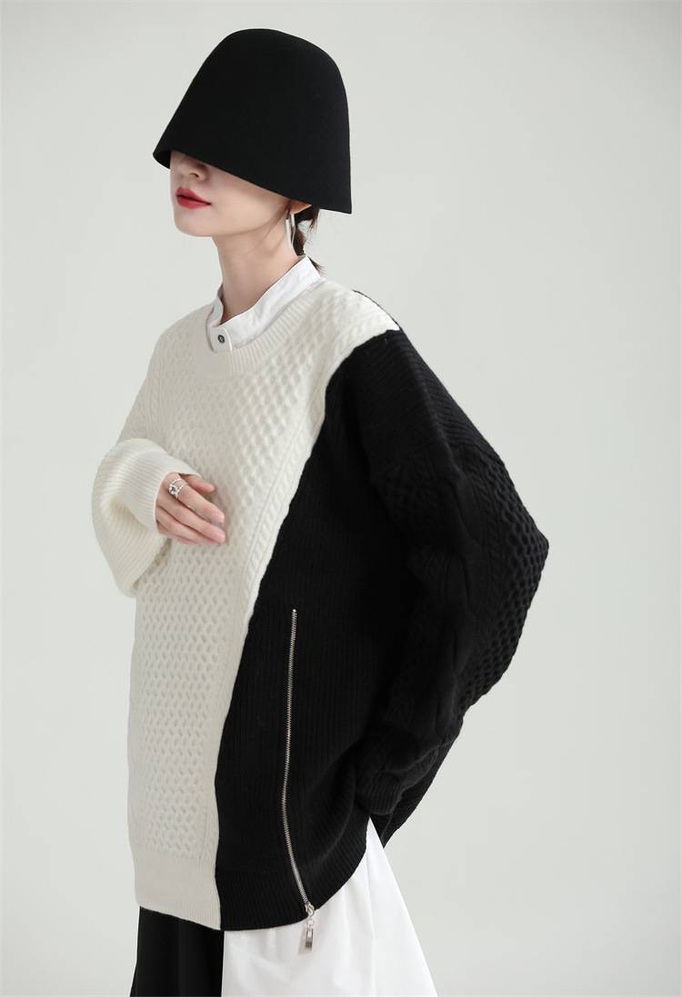 宽松廓形大毛衣女2022冬季新款时髦简约中长款撞色拉链厚实针织衫