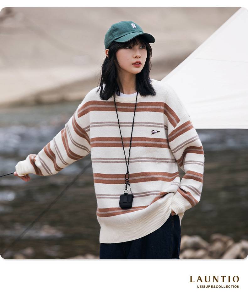 2022秋季中性慵懒风毛衣男女同款日系复古简约刺绣条纹毛衣