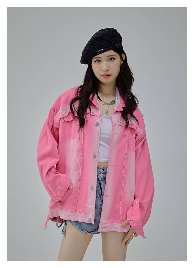 甜辣少女2022十三行早秋新品洗水做旧渐变粉色翻领牛仔外套女