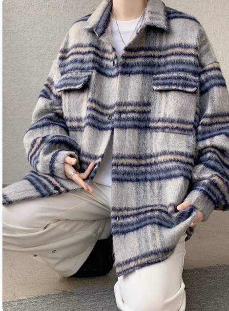 条纹格子毛呢外套男小香风秋冬款加厚夹棉海马毛美式工装飞行夹克