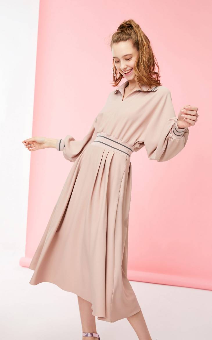 2019春季新款条纹装饰V领收腰连衣裙 180.00 已售:0件