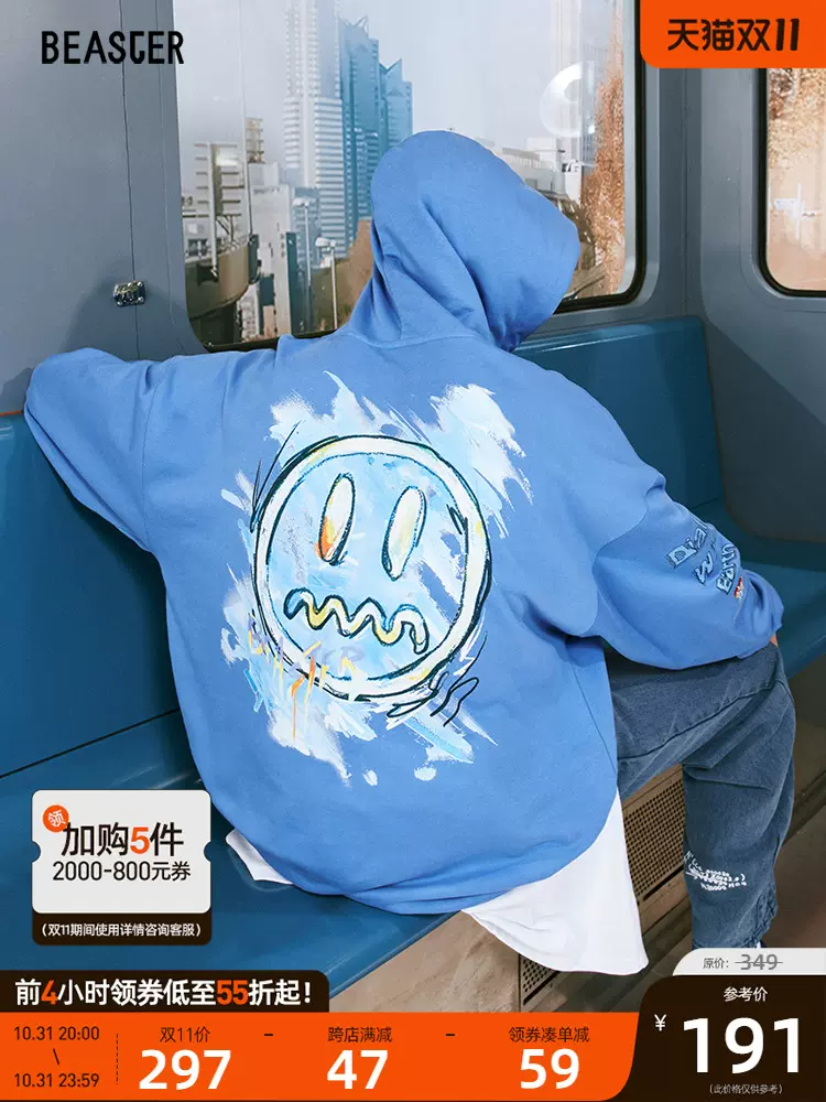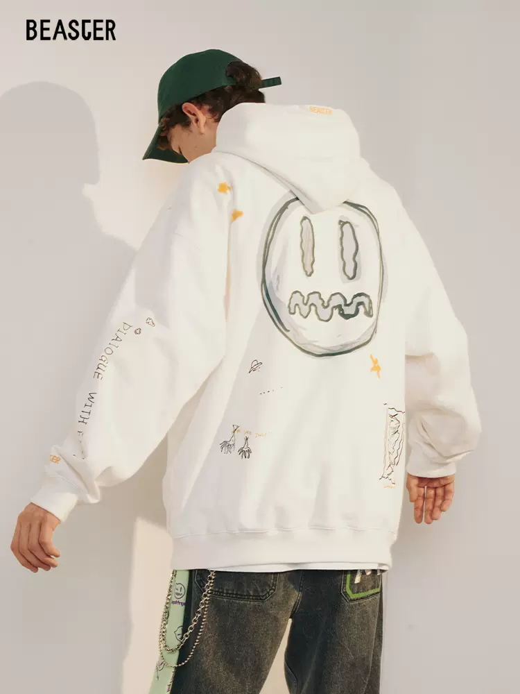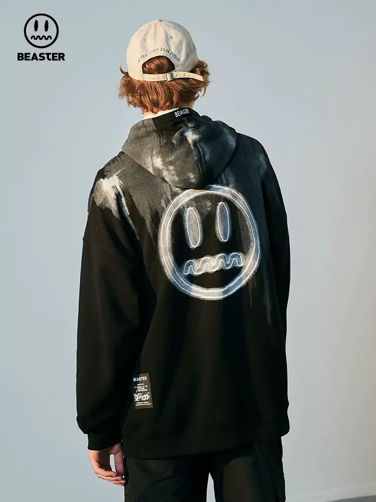 BEASTER小恶魔鬼脸卫衣毛圈针织印花渐变宽松休闲圆领抽绳连帽衫