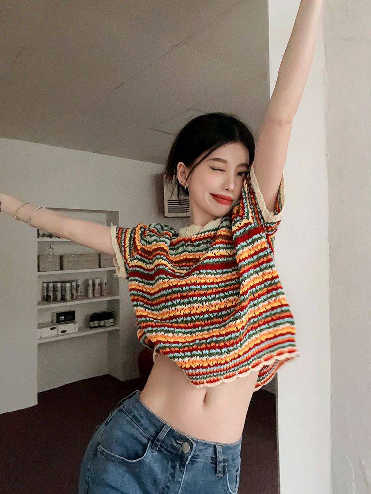 KRSEED彩虹条纹冰丝针织衫女夏季设计感小众甜酷辣妹镂空短袖上衣