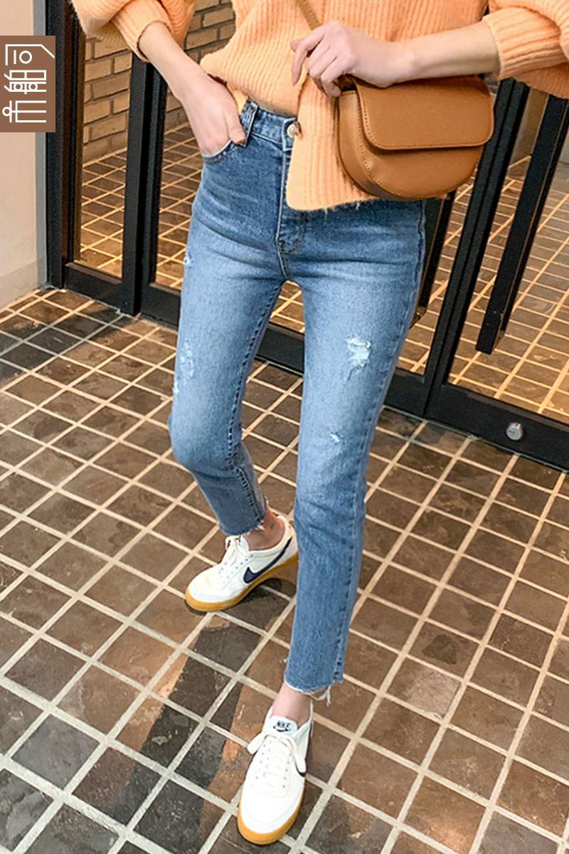 韩国 市舶司女装2019春装新款直筒高腰磨破毛边九分牛仔裤KS1329