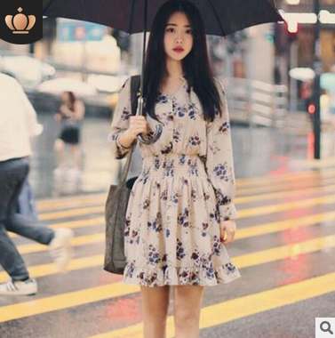 2019春季新款韩版时尚新街百搭小碎花长袖雪纺碎花连衣裙