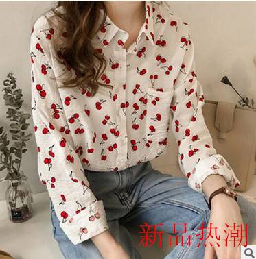 2019春季韩版宽松甜美樱桃印花小清新长袖寸衫女学院风