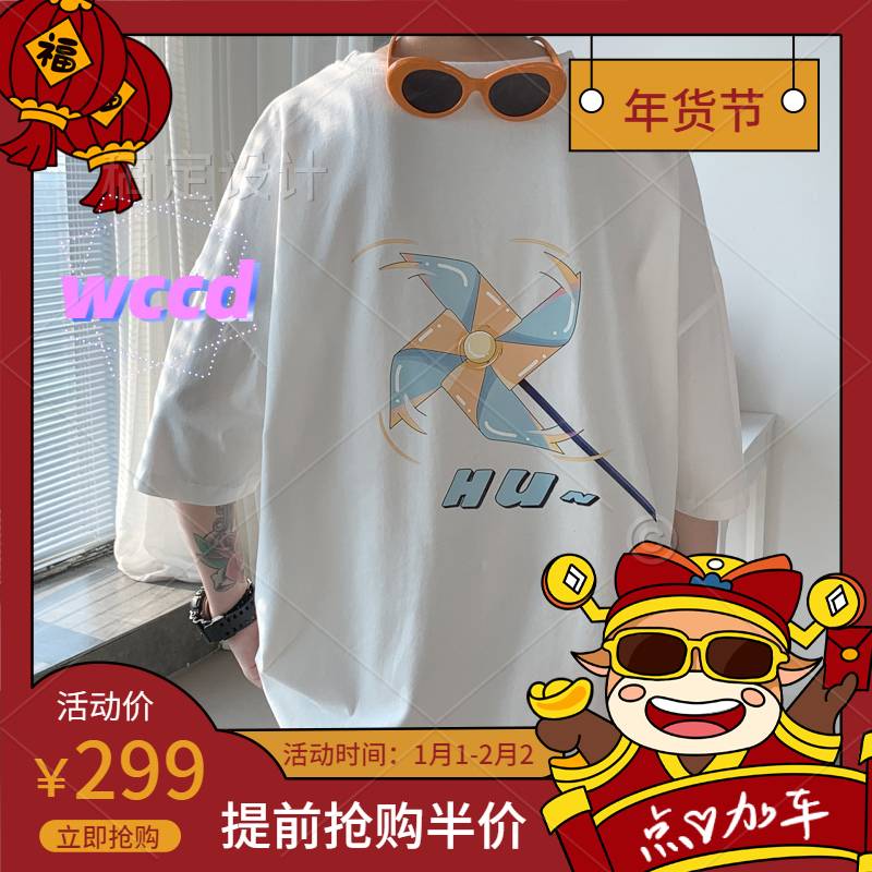 wccd卡通风车印花T恤男韩版潮流百搭宽松短袖港风潮牌ins休闲学生上衣