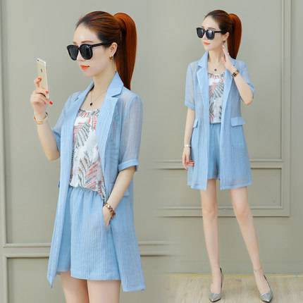 雪纺西装套装女2018新款夏时尚吊带小西装外套女薄款短裤三件套女