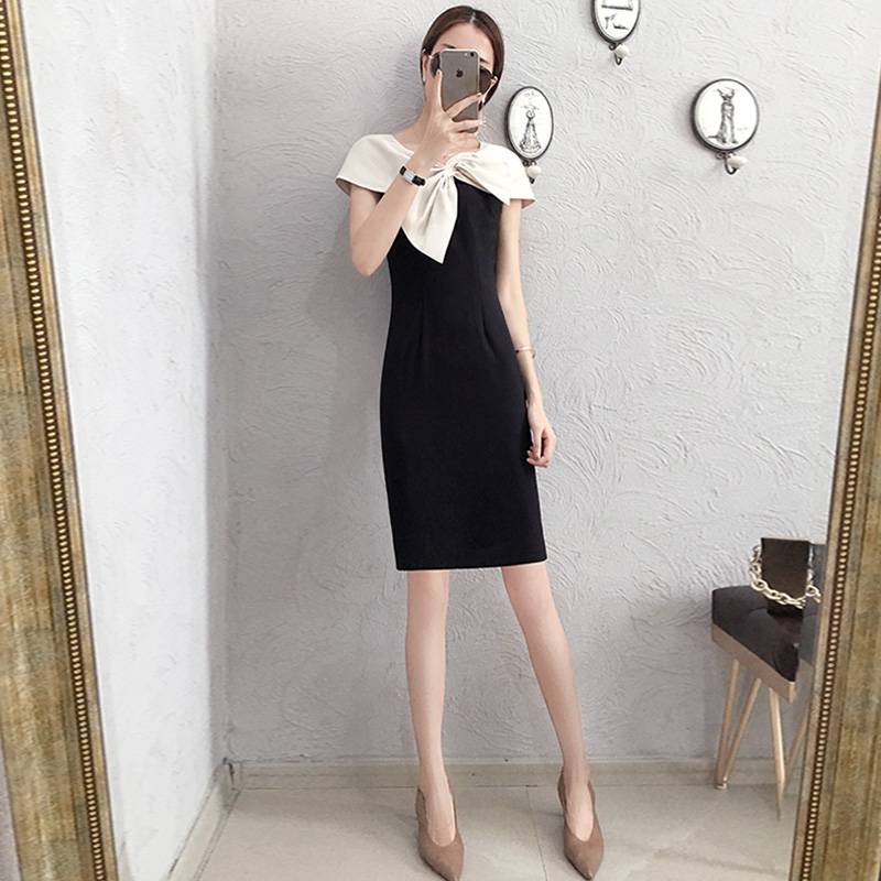 蝴蝶结黑色拼接连衣裙女夏季2018新款气质名媛修身包臀裙子中长款