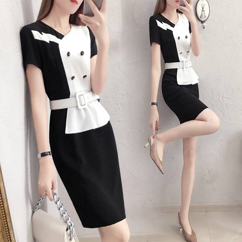 黑白拼接职业连衣裙女夏2018新款时尚气质收腰包臀裙中长款显瘦秋