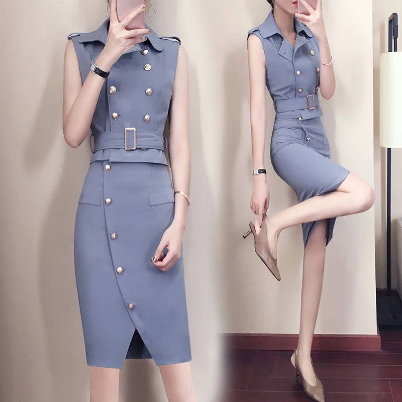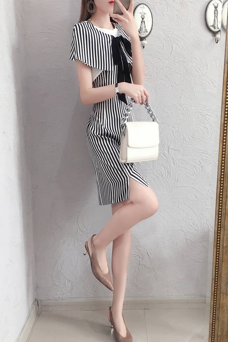竖条纹连衣裙女夏季2018新款时尚气质修身两件套裙子中长款显瘦秋