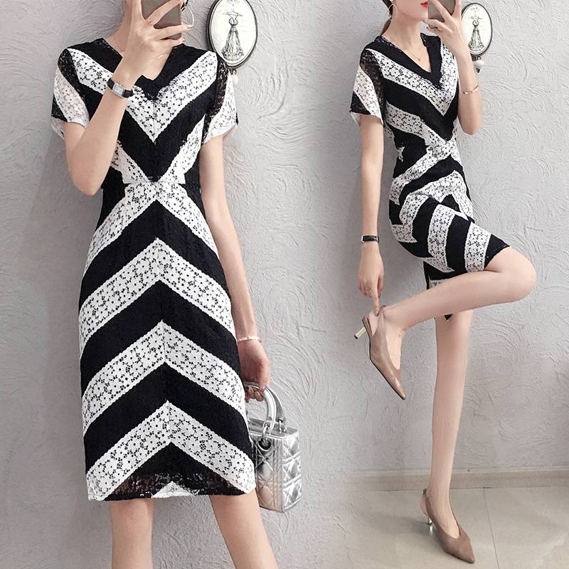 早秋名媛蕾丝连衣裙2018新款女装气质修身条纹包臀裙中长款显瘦夏