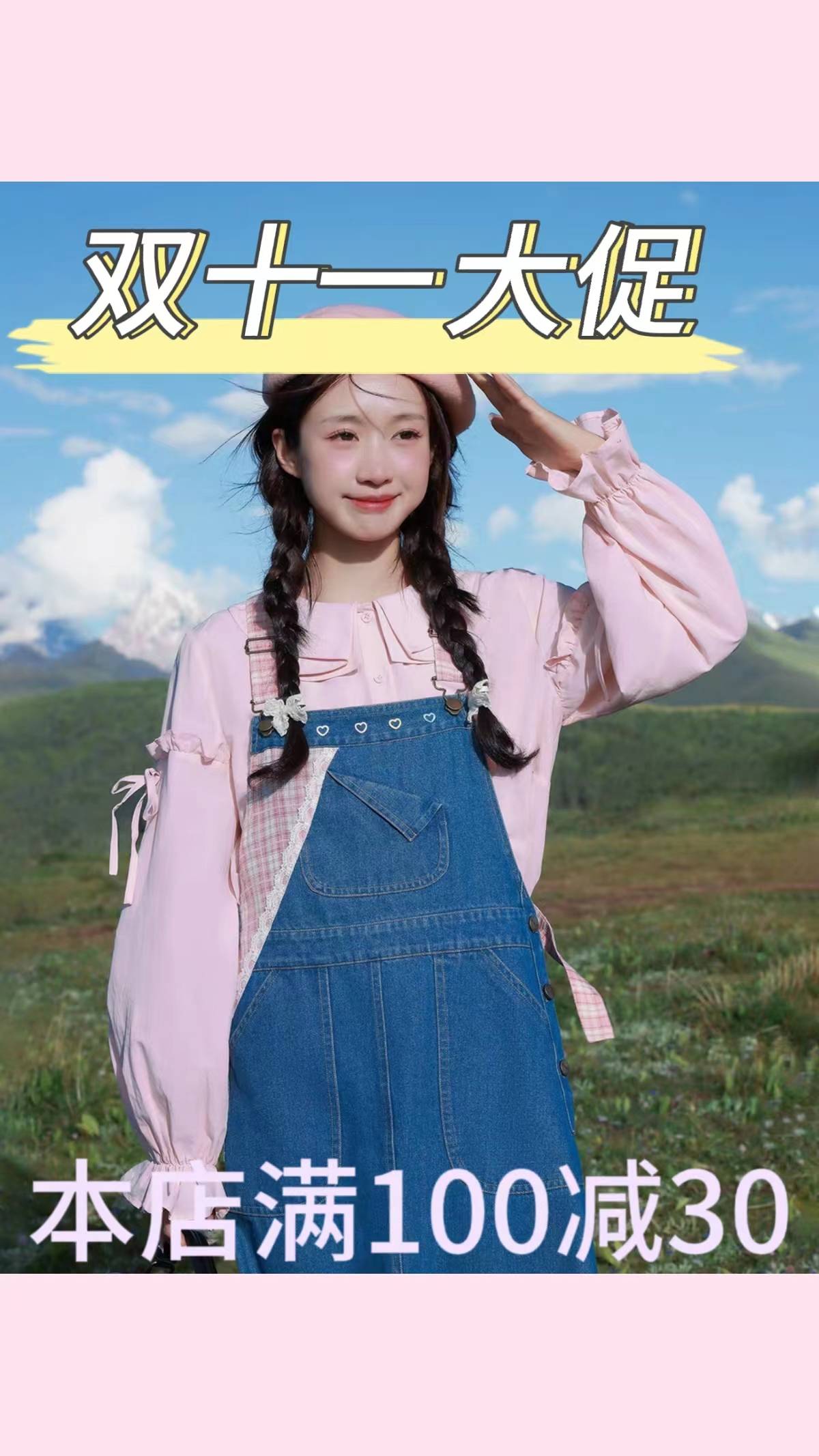 日系粉格牛仔背带裙粉色衬衫蝴蝶结连衣裙女可爱甜美两件套