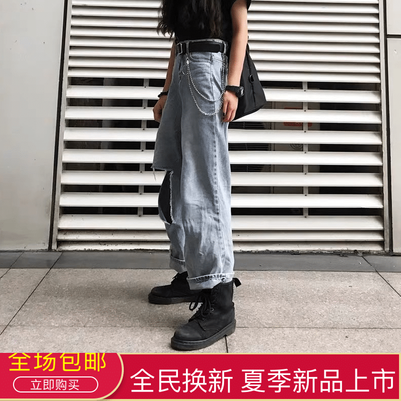 2020春夏新款批发松紧腰高腰牛仔裤女宽松直筒显瘦阔腿长裤