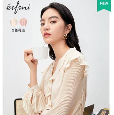 伊芙丽雪纺女上衣2020新款春秋韩版泡泡袖压褶飘带领木耳边雪纺衫