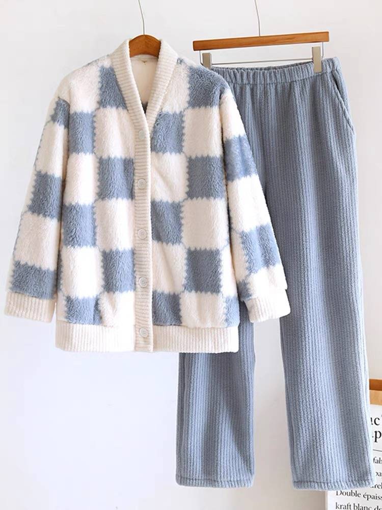 睡衣女冬季加厚加绒法兰绒保暖珊瑚绒简约休闲格子开衫家居服套装