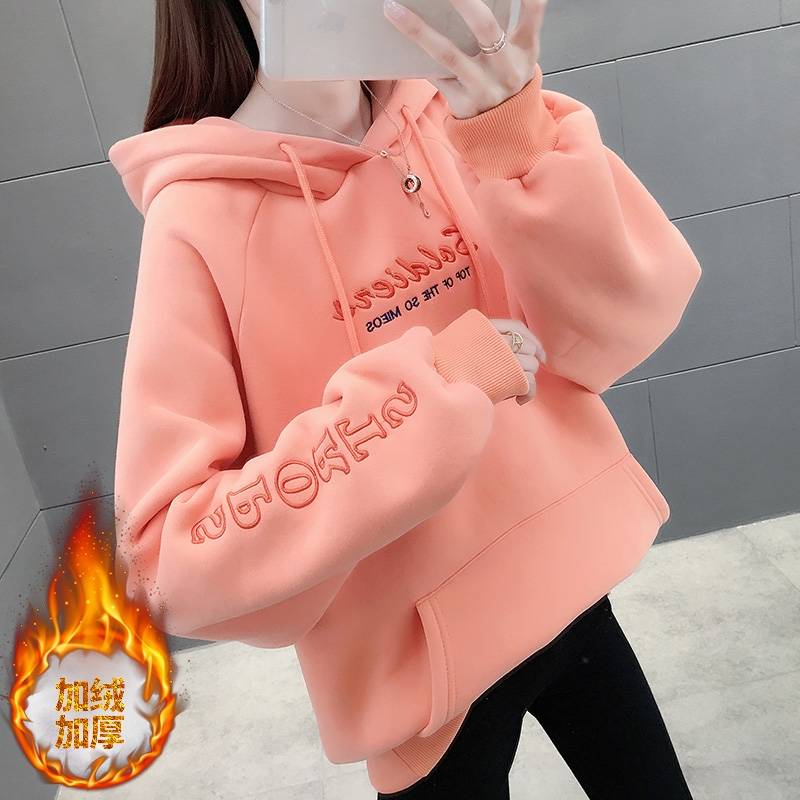 秋冬加绒加厚卫衣女连帽衫韩版学生宽松大码长袖上衣外套