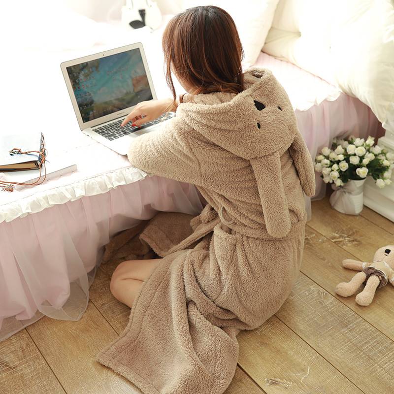 韩版秋冬季法兰绒睡袍女冬卡通连帽珊瑚绒浴袍兔耳朵公主睡衣加厚