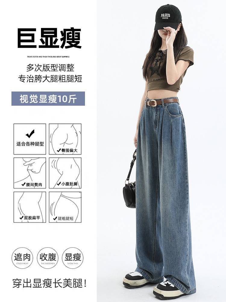 高腰阔腿牛仔裤女垂感宽松2023年百搭美式设计感拖地褶皱直筒裤子