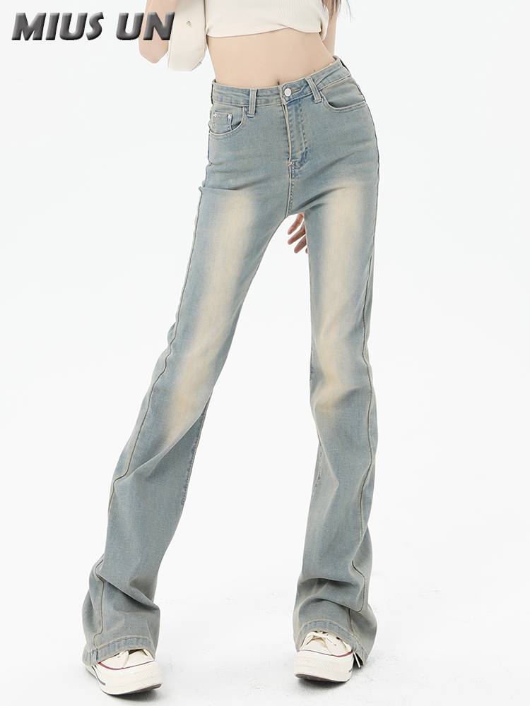 MiusUN复古奶油色牛仔裤女高腰23秋季修身弹力显瘦微喇叭拖地长裤