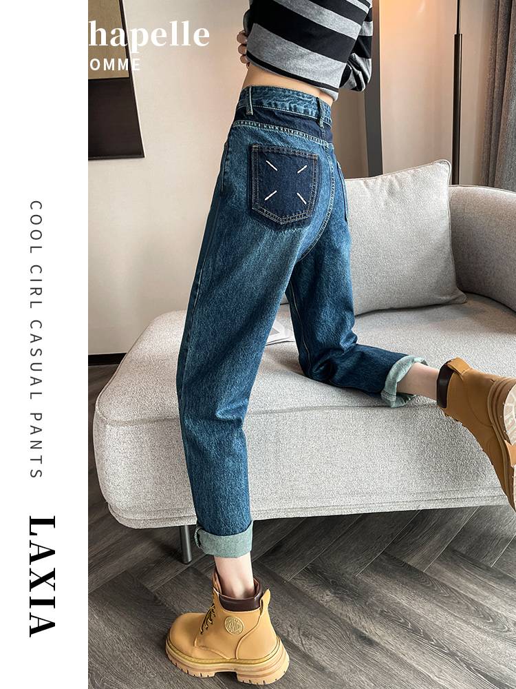 深蓝色高腰哈伦牛仔裤女春秋季2023年新款