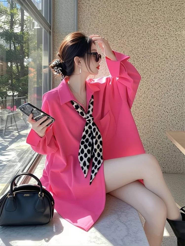 2025春季新款独特超好看洋气减龄设计感粉色领结长袖衬衫连衣裙女