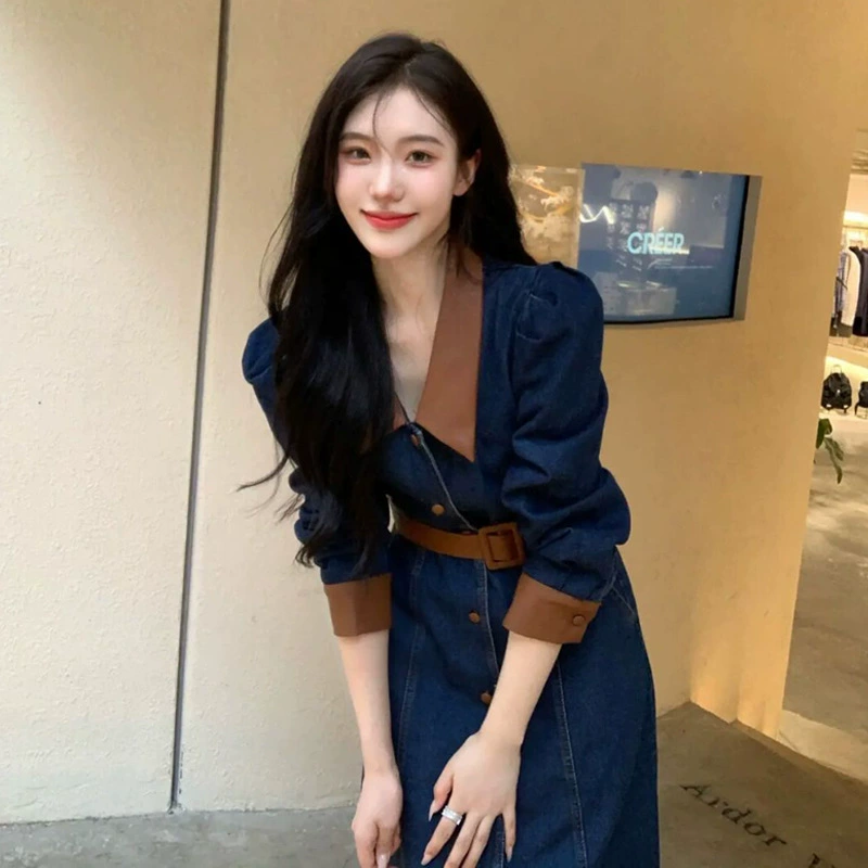 早春秋季女装2023法式感收腰夏设计中长裙牛仔连衣裙子港风复古