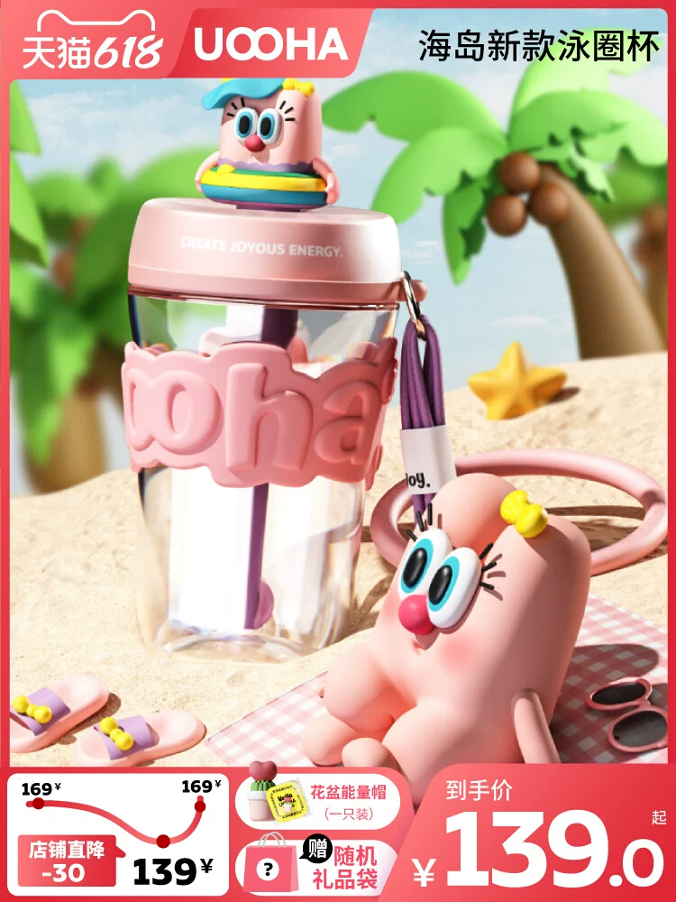 uooha海岛假日泳圈杯女高颜值儿童大容量吸管杯可爱夏季学生水杯