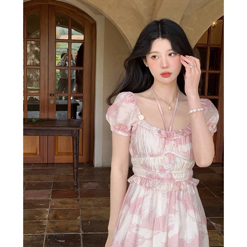 网红长裙 绝美仙女印花T丝短袖连衣裙中长款方领泡泡袖2022潮女 148.00 已售:0件
