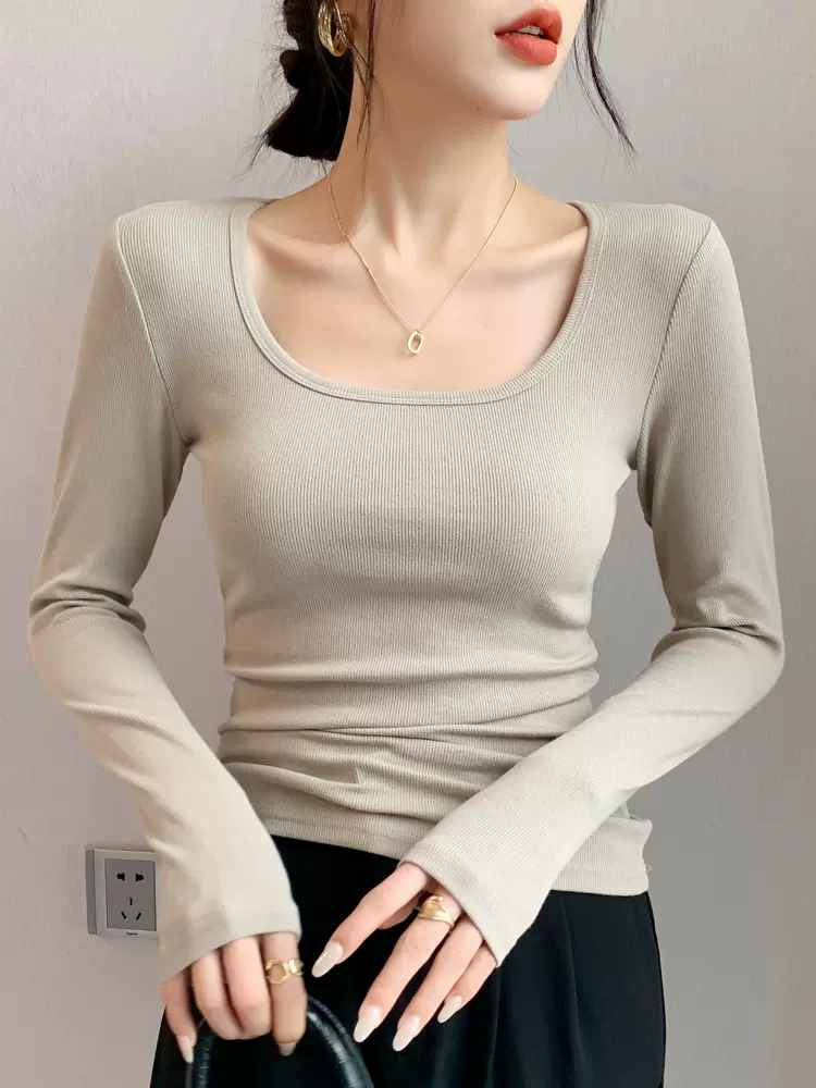 打底衫女2023秋冬新款U领长袖t恤修身内搭大领口方领白色上衣
