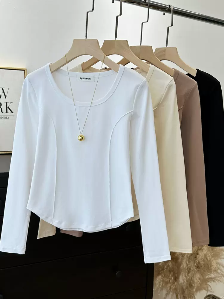 2023新款秋冬长袖t恤女纯棉鱼骨上衣设计感修身体恤正肩打底衫
