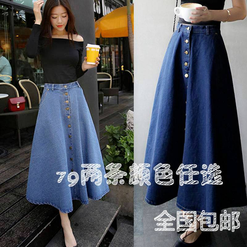 2019新款单排扣牛仔半身裙中长款高腰显瘦大摆a字长裙女