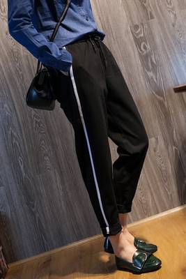 侧条纹运动裤女2019春秋薄款ins宽松大码黑色九分哈伦裤休闲裤潮