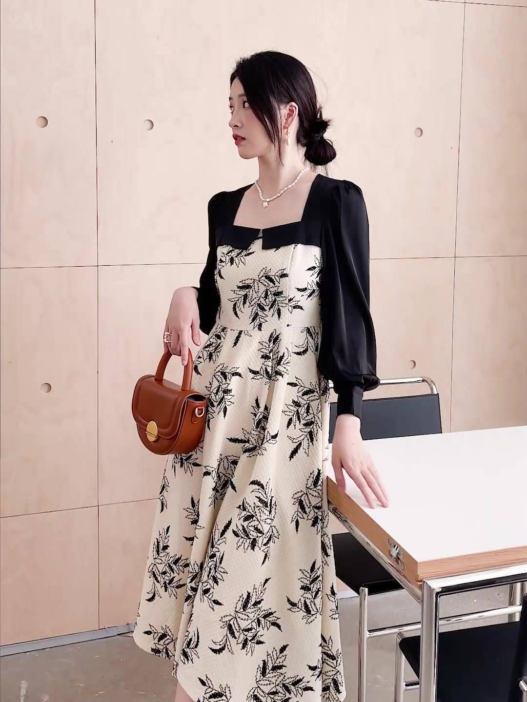 法式复古方领连衣裙女气质印花中长裙