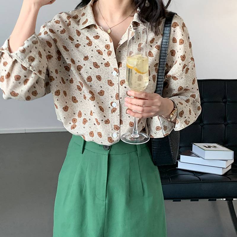 小方领碎花雪纺衫丝滑不易皱长袖衬衫女