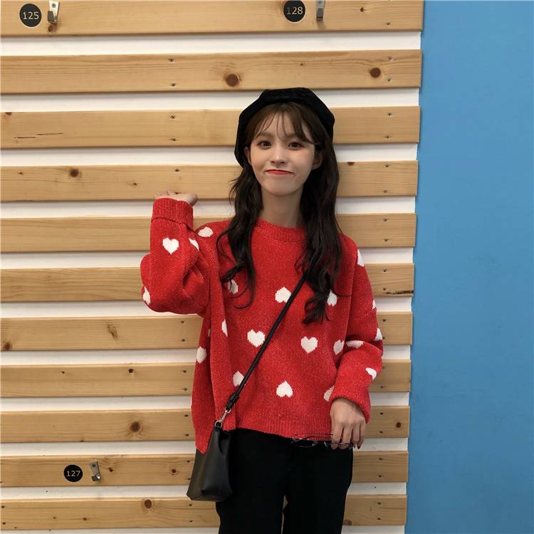 秋冬韩版毛衣宽松圆领套头撞色爱心针织毛衫可爱甜美风爱心上衣