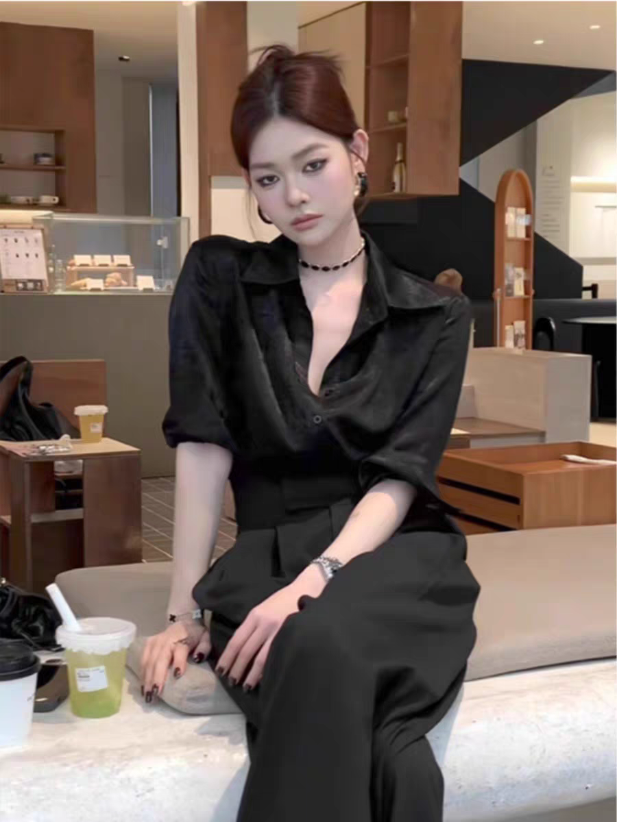 气质轻熟风黑色衬衫女装2025夏季新款韩版高级感上衣时尚中袖衬衣