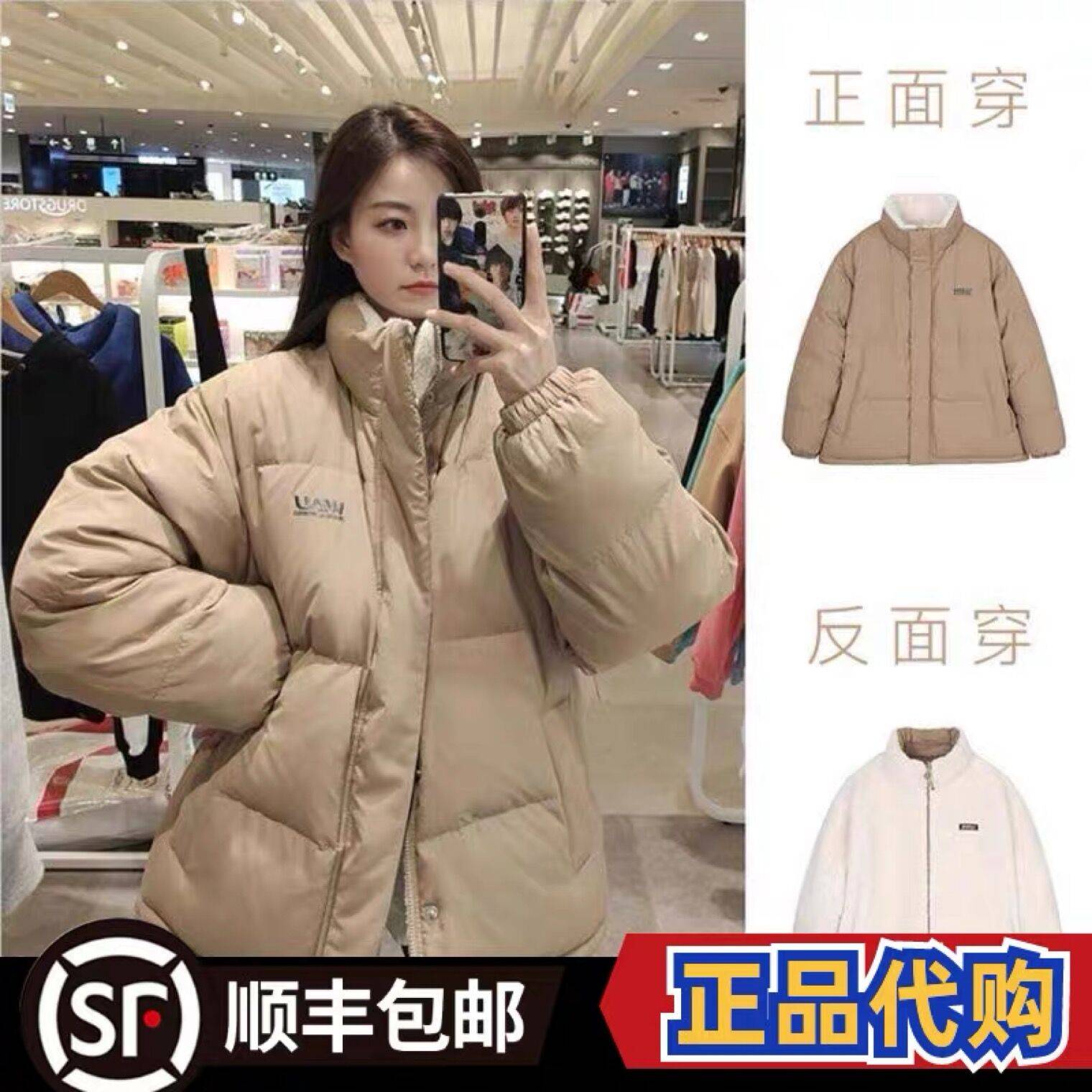 韩国代购whoau羽绒服冬季两面穿加厚羊羔绒情侣短款外套上衣男女