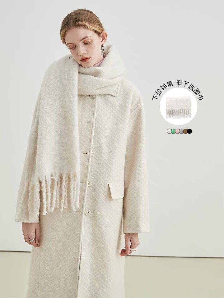 VEGACHANG【限时送围巾!】学院风毛呢外套女中长款肌理感大衣