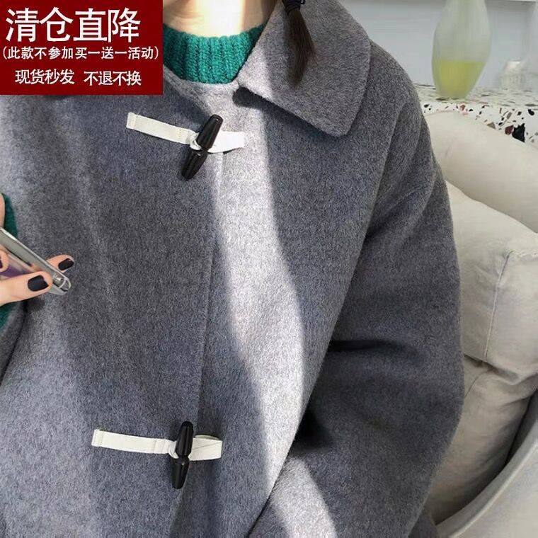 【限时价】oopsmarket初恋粉/犀牛灰澳毛牛角扣大衣双面呢外套